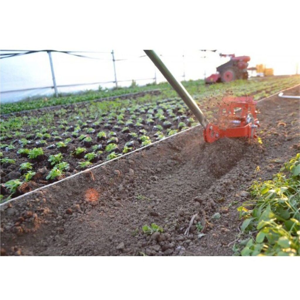In the previous roller form, the wheels break up the soil and make way for the blade behind it. The sharpened blade finishes the final task by rooting out the weeds and leveling the soil. The blade has depth adjustment and roller angle adjustment.