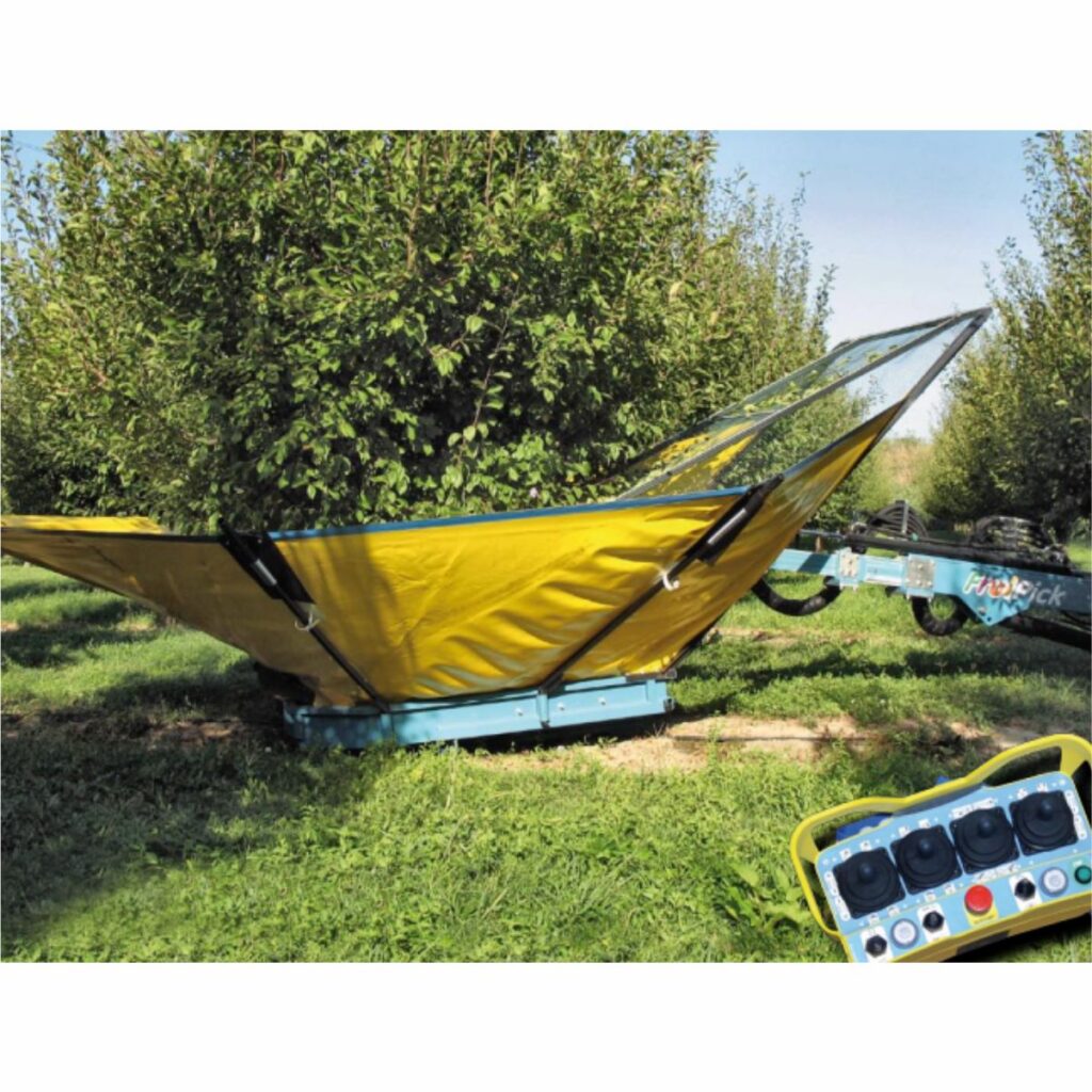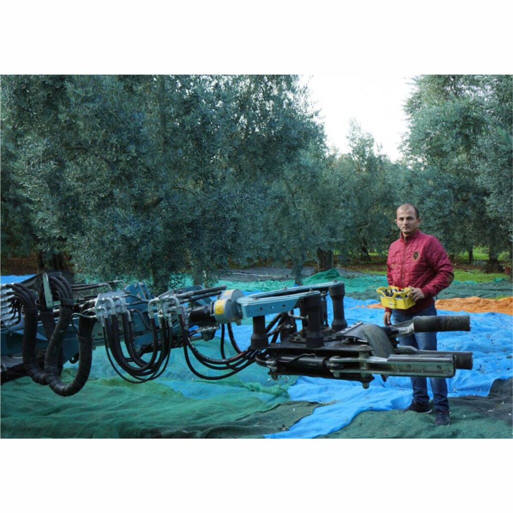 Its telescopic arm, which can extend to 6 meters vertically and 65° horizontally to the right or left, controlled by wireless remote, allows harvesting of 2-3 trees without moving the tractor.