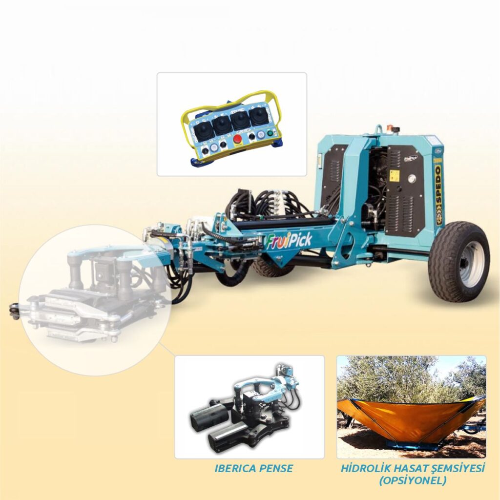 Its extendable system can grasp the trunk or main branches from a distance of up to 7 meters at the desired angle. This system eliminates the need to move the machine to each tree individually. While the tractor remains stationary, it can harvest 2-3 trees at once.